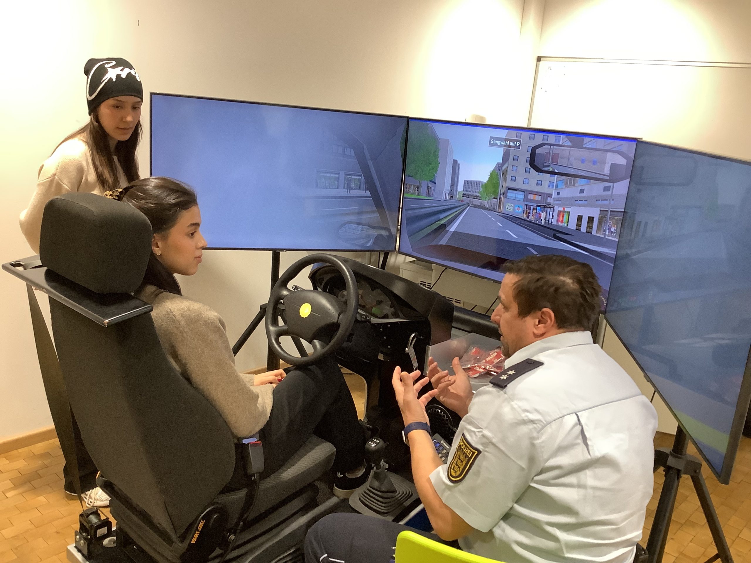 - Fahrsimulator: Hier wurde es technisch. Während die Schülerinnen versuchten, eine virtuelle Strecke zu bewältigen, sorgten die Polizeibeamten gezielt für Ablenkung. Einmal nüchtern, einmal mit simulierten 1,1 Promille. Die Folge? Übersehene Schilder und heftige Crashs.