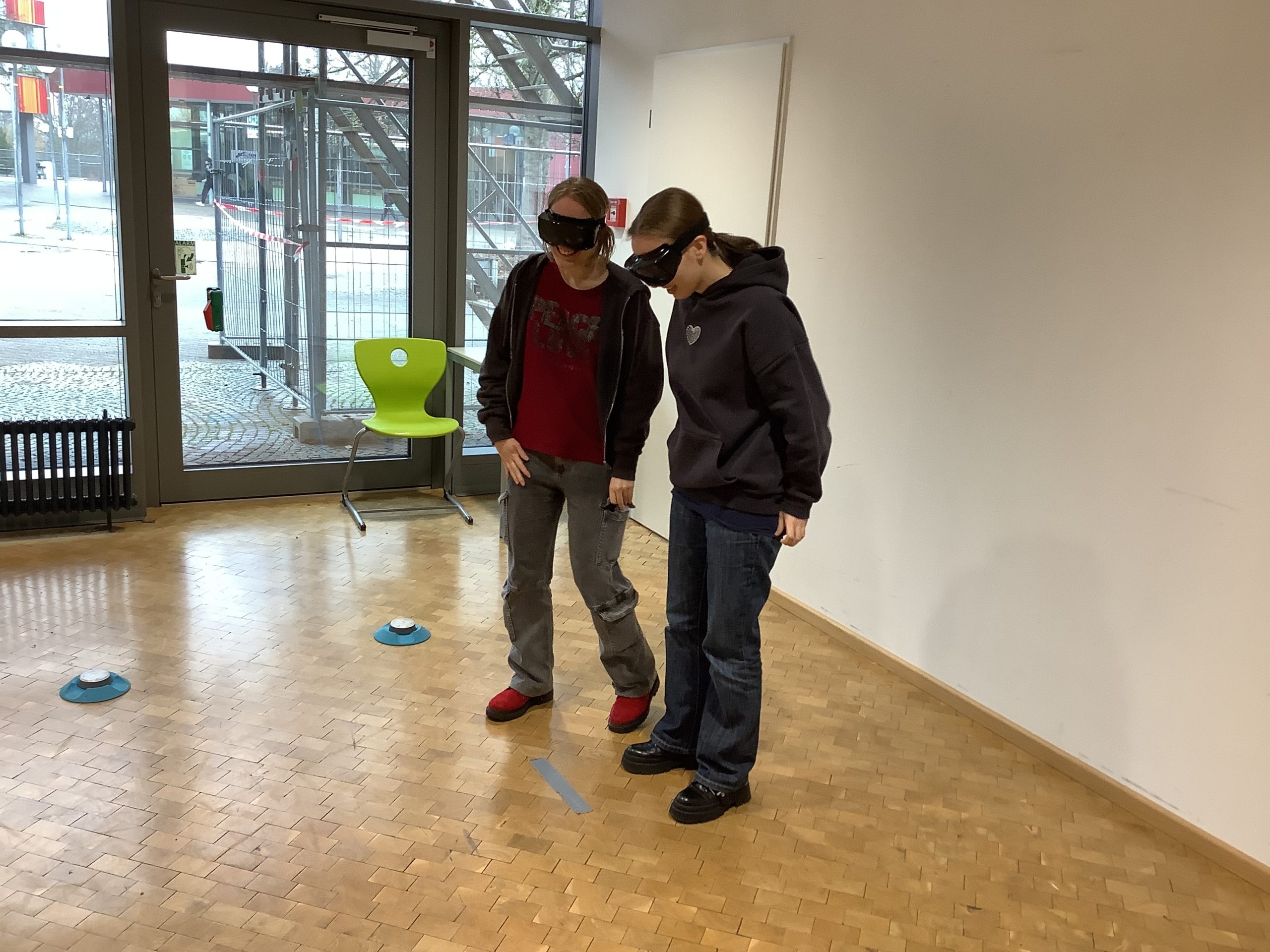 - Pods-Wettstreit: Zwei Schülerinnen (und sogar die Lehrerinnen!) traten gegeneinander an, um leuchtende Pods mit dem Fuß zu erwischen. Mit Rauschbrille ein Problem – man tritt schlichtweg daneben, weil das räumliche Sehen komplett aussetzt.
