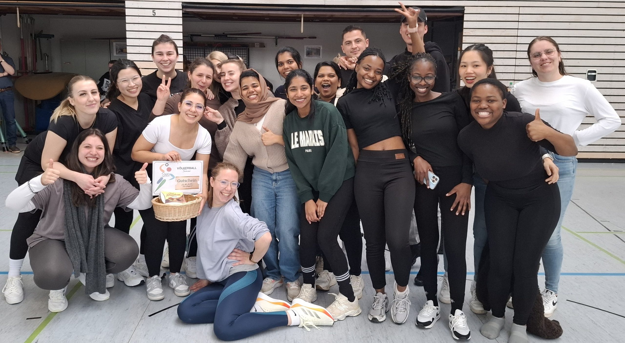 Nicht nur auf dem Spiel­feld war einiges los – auch daneben wurde für ordent­lich Stimmung gesorgt. Die Schüle­rin­nen und Schüler, die nicht spiel­ten, feuer­ten die Teams lautstark an und verwan­del­ten die Halle in eine echte Völker­ball-Arena. Für beson­ders kreati­ves und engagier­tes Anfeu­ern wurde ein Zuschau­er­preis verge­ben, den sich das Team Ballia­tiv Pflege sichern konnte.