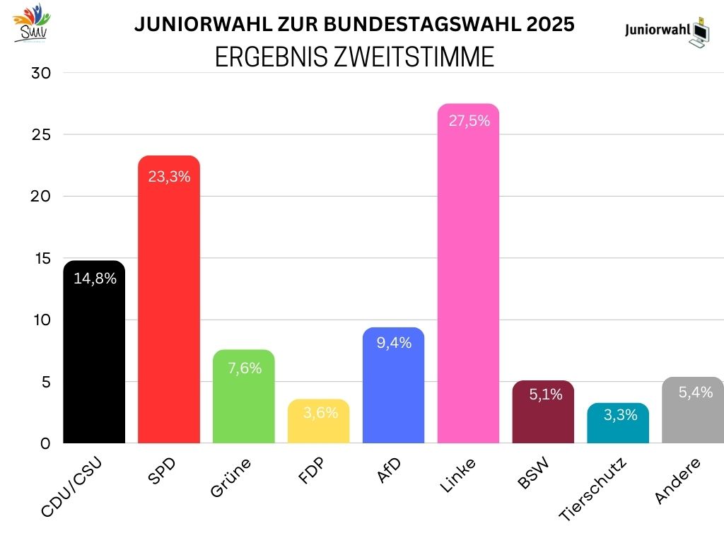 Die Ergeb­nis­se der Junior­wahl 2025 an unserer Schule zeigen ein großes politi­sches Engage­ment unserer Schüle­rin­nen und Schüler. Beson­ders auffäl­lig ist die starke Unter­stüt­zung für die SPD und die Linke, die sowohl bei der Erst- als auch bei der Zweit­stim­me hohe Werte erziel­ten. Während die CDU/CSU und die Grünen modera­ten Rückhalt fanden, schnit­ten FDP und AfD eher schwä­cher ab.